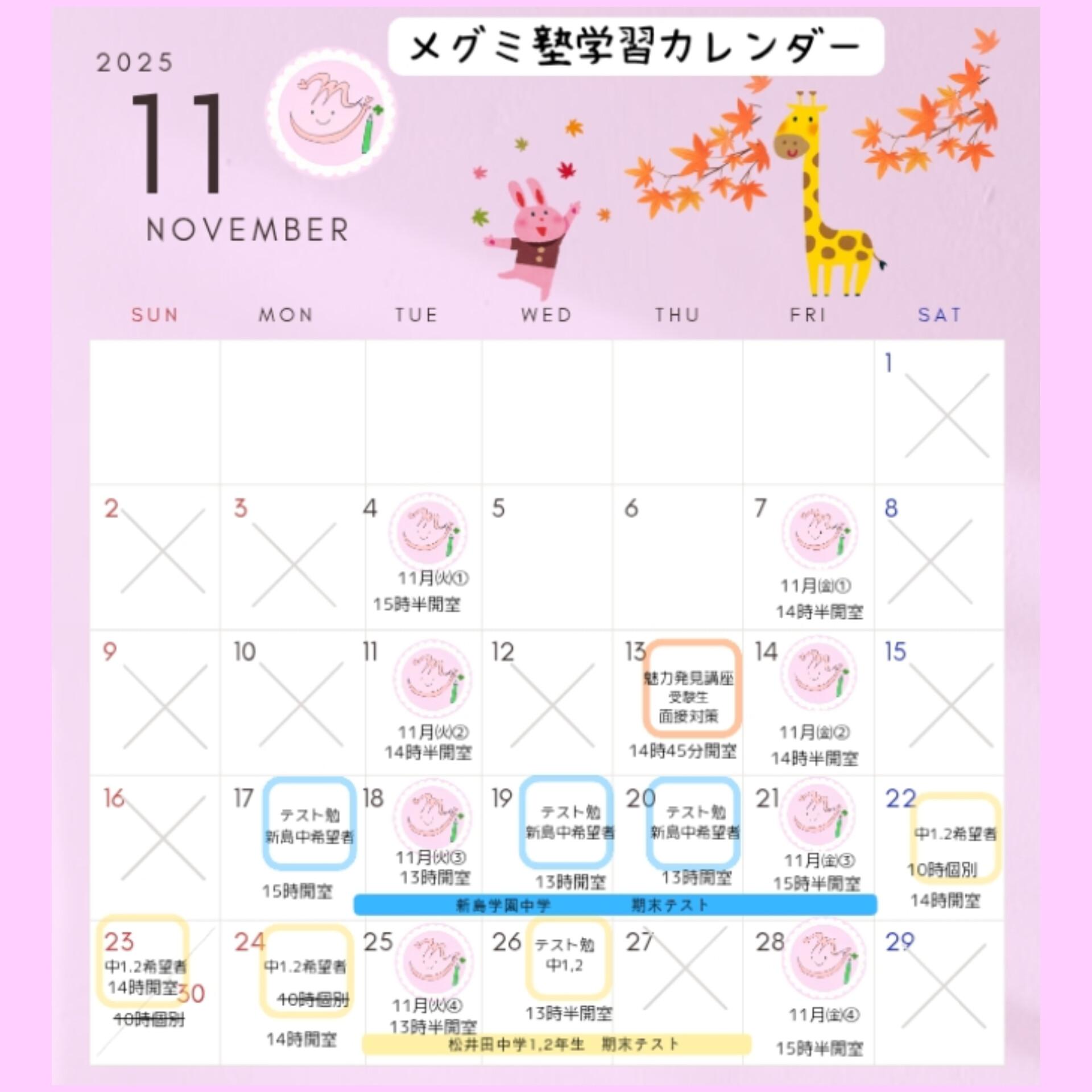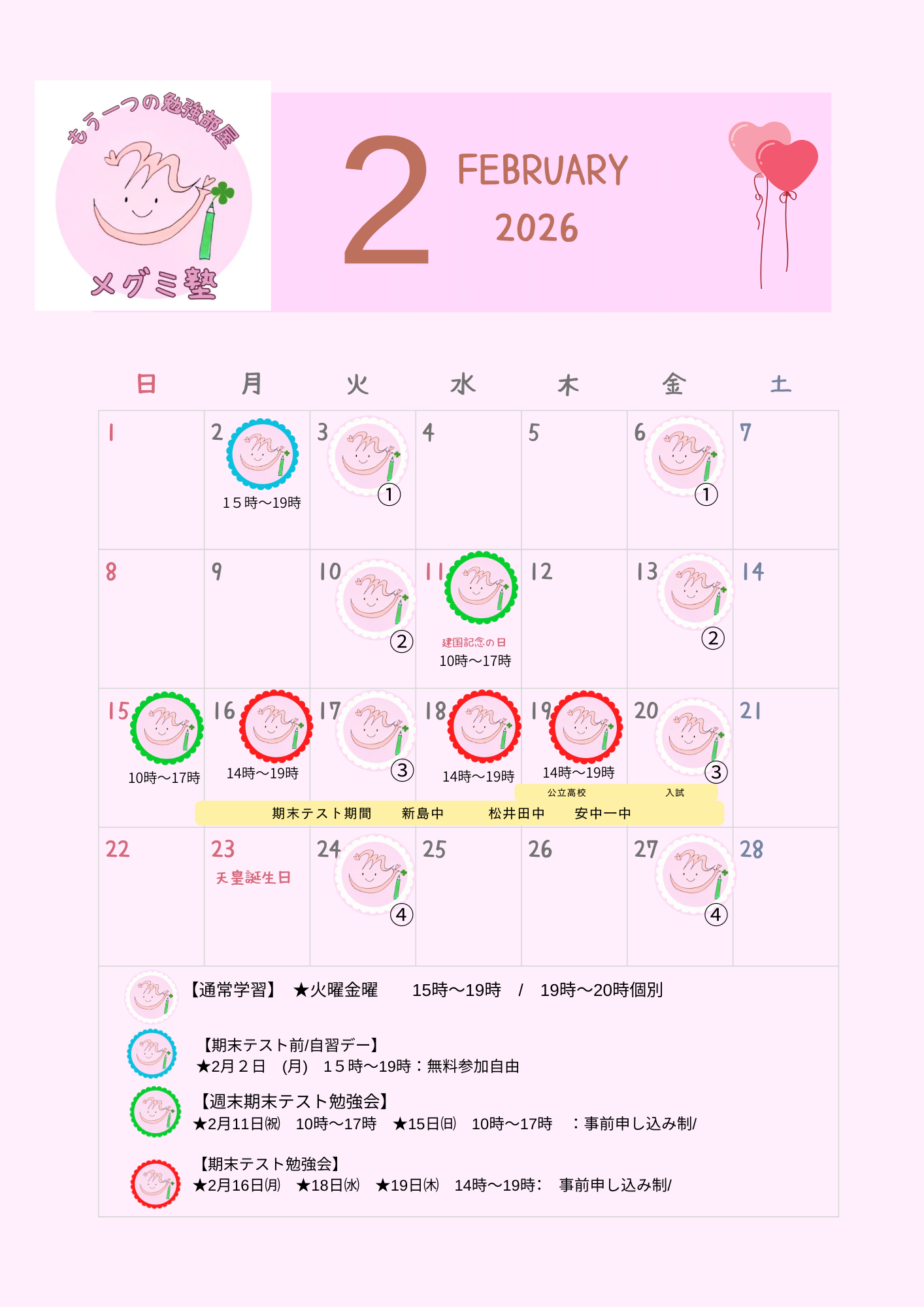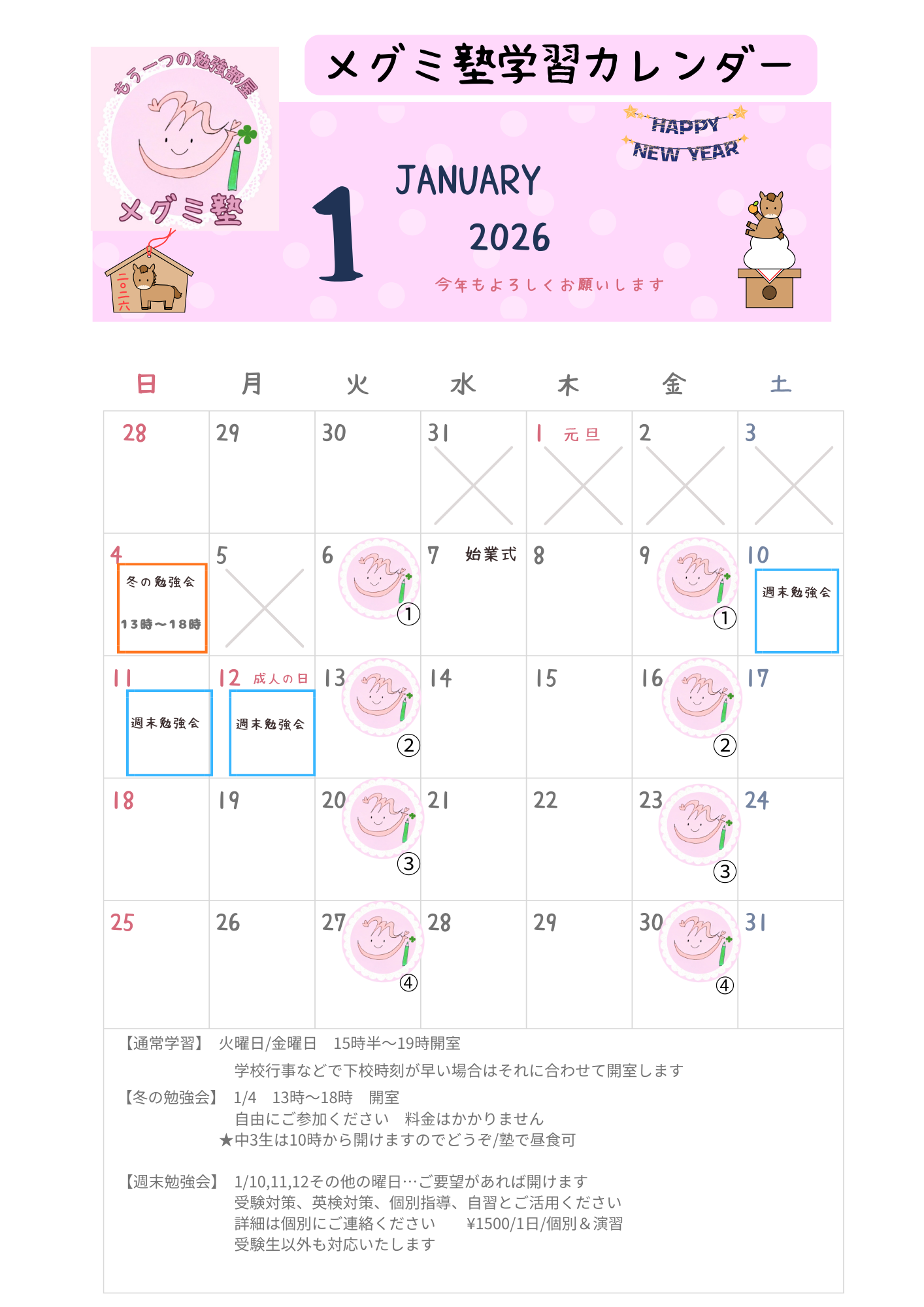 【通常学習の曜日と時間】 〈火曜日金曜日〉 【16:00~】 個別指導コース/1:1 【17:00~17:50】 小学生週2コース/少人数グループ 【18:00~19:20】【冬期は17:30~18:50】 中学生週2コース/少人数グループ ※学校帰りに直接来られるよう学校の下校時刻に合わせています 【19:20~20:20】 個別指導コース/1:1 【20:30~21:30】 個別指導コース/1:1 ※尚、季節や行事によって部活終了時間が異なるため、 時間は変更することがございます ※集団授業ではないので小学生でも中学生と同じ時間帯でも受講できます ごきょうだいでご利用の時などご相談ください ※個別枠は満席となっています ---------------------------------------------- 【希望者のみの特別講座】 ★定期テスト対策講座 〈期末テスト前の週末&テスト1日目2日目終了後〉 〇テスト範囲の学校使用の数学英語のワーク 〇提出課題のチェック 〇数学英語以外の教科(音楽、家庭科、美術…など)にも対応 ★夏期★冬期★春期講習 〈夏休み冬休み春休み中の数日〉 〇学校の長期のお休みを利用し、学校の課題や 復習やまとめ、弱点の強化など集中しておこないます ※月謝の他に別途料金がかかるため、希望者のみとしておりますが できるだけ受講をおすすめしております ※日程&料金&申込み方法などは”教室だより”にて配布します 詳細は直接お問い合わせください ※ホームページでもご案内いたします ---------------------------------------------- |
